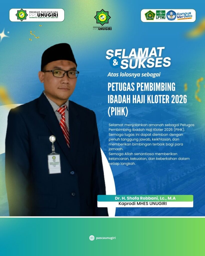 Kelolosan Ketua Program Studi Magister Hukum Ekonomi Syariah (MHES) Pascasarjana Universitas Nahdlatul Ulama Sunan Giri (UNUGIRI) Bojonegoro, Dr. H. Shofa Robbani, Lc., M.A, sebagai Petugas Pembimbing Ibadah Haji Kloter Tahun 2026 (PIHK) merupakan bentuk kepercayaan sekaligus pengakuan atas kompetensi, integritas, serta pengalaman beliau dalam bidang keilmuan dan pembinaan keagamaan. Amanah ini tidak hanya menjadi kebanggaan pribadi, tetapi juga menjadi kebanggaan bagi sivitas akademika Prodi MHES dan Pascasarjana UNUGIRI Bojonegoro.